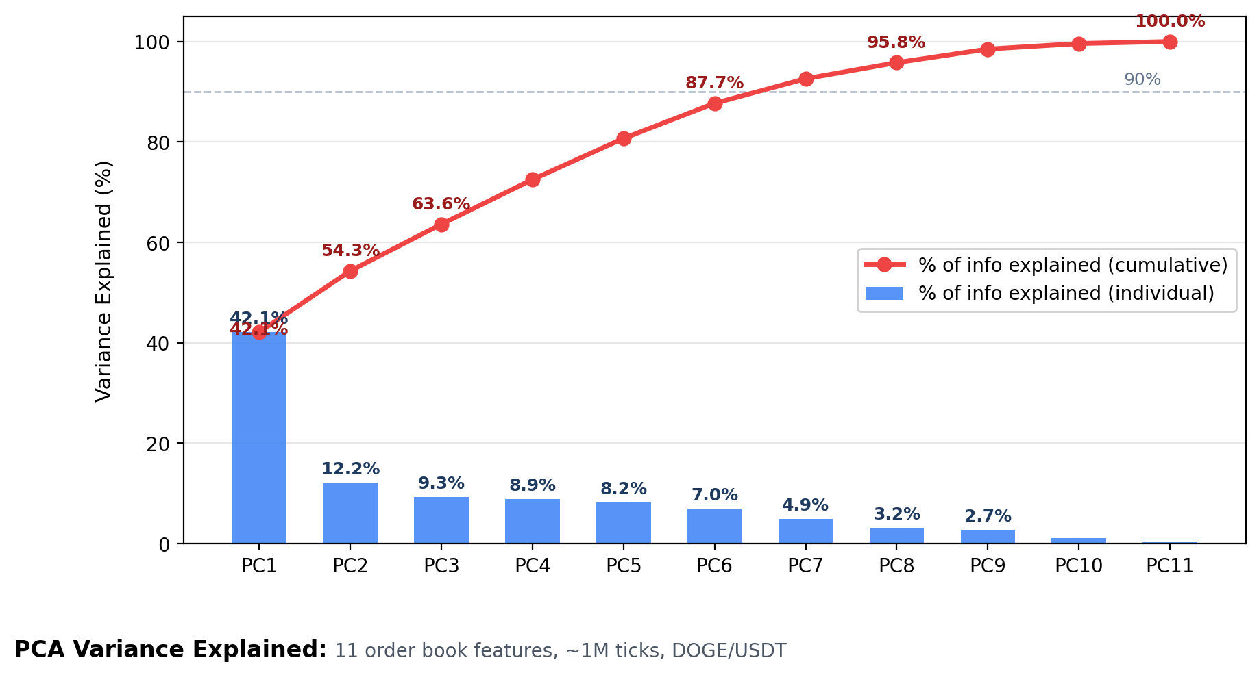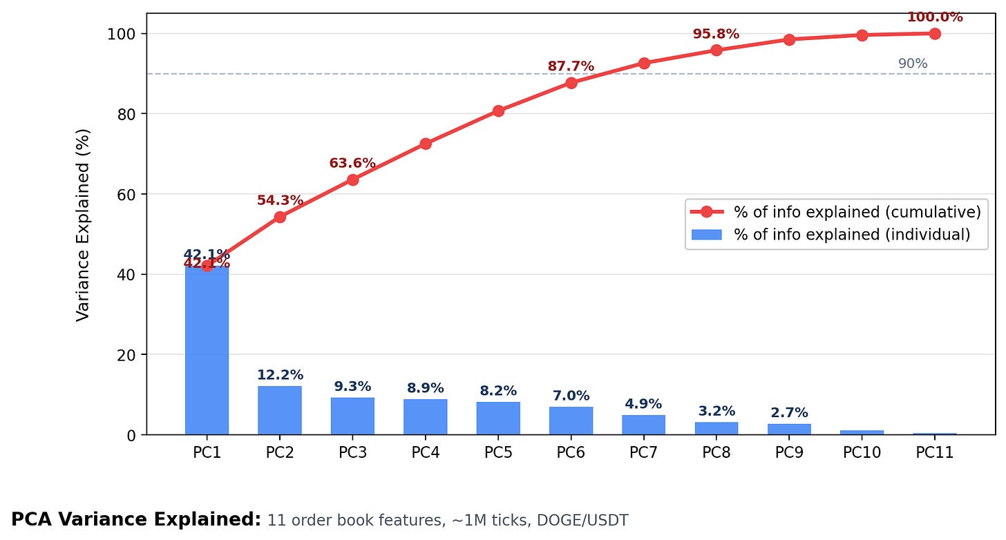 The useful property: diminishing returns kicks in fast. In most real-world datasets, the first two or three components capture 80–90% of the meaningful structure. The rest is noise, redundancy, or detail that doesn’t drive decisions at speed. Furthermore, in the following example we decompose hundreds of variables into 10 PCAs.