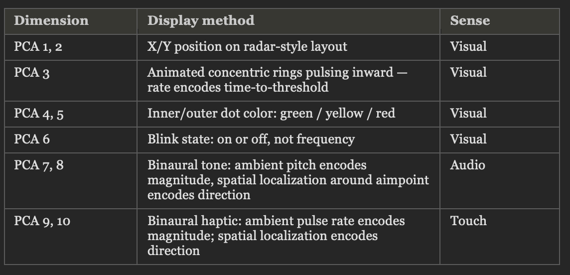 We tested two additional sensory channels alongside the visual display. The table below shows the full result: ten PCA dimensions, three sensory channels, zero hours of training required to execute on.